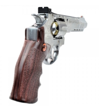 Prodotto da Bruni, nuovissimo revolver ad aria compressa modello chrome barrel 6", colore argento.