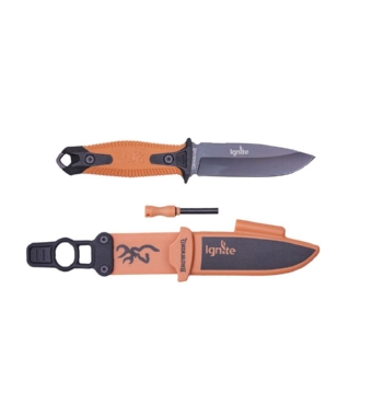 Coltello Survival con acciarino. Browning Coltello Ignite è realizzato in acciaio inossidabile con un design a punto di caduta perfetto per costruire un rifugio o pulire e preparare piccola selvaggina.