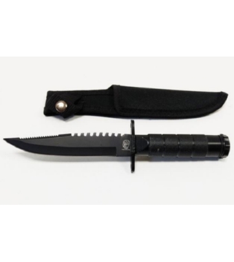 Realizzato con lama in acciaio 420 seghettata nella parte superiore, paramano in acciaio, impugnatura in metallo, colore nero.
