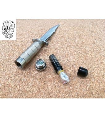 Prodotto da Cougar Collection, coltello survival compatto full metal con kit di sopravvivenza e fodero.