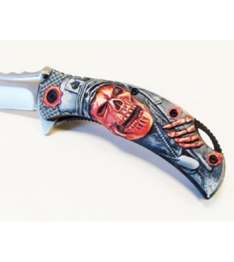 Realizzato con lama in acciaio stainless steel 420, impugnatura in abs con fantasia scheletro in rilievo.