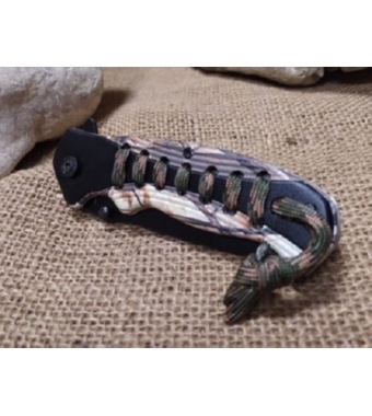 Realizzato con lama in acciaio inox 420 aisi liscia di colore nero, impugnatura in abs antiscivolo in colorazione mimetica con inserti in paracord.