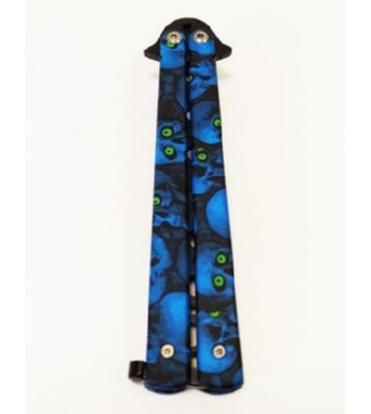 Balisong butterfly a filo singolo grande con fantasia teschi in colorazione blu.