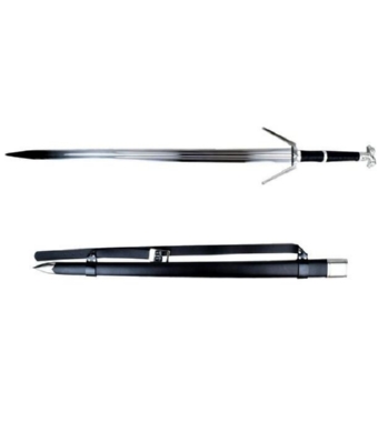 Spada dalla serie di videogiochi the witcher modello serpentine silver sword di geralt of rivia. Geralt attraverso le sue avventure, usava questa spada per combattere i mostri che incontrava. Realizzata con lama in acciaio 440, elsa in metallo con rivestimento in corda, fodero in similpelle con cinghia per aggancio dietro la schiena. Peso 1580g, lunghezza totale 115,5cm, lunghezza lama 89,5cm.