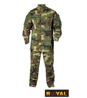 PRODOTTA DALLA ROYAL PLUS, DIVISA MILITARE MIMETICA CON TAGLIO ACU, IN COLORAZIONE WOODLAND COMPOSTA DA 2 PEZZI: GIACCA E PANTALONE.