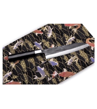 La serie di coltelli Samura Super 5 combina design tradizionale, materiali avanzati e qualità giapponese. I coltelli sono forgiati a mano a 5 strati in acciaio giapponese VG-10 di alta qualità con piastre Damasco. La durezza delle lame è molto alta (61 HRC), e i coltelli tagliano uniformemente e con precisione. Il manico realizzato in micarta è piacevole da toccare e, grazie alla sua forma ergonomica, si adatta perfettamente alla mano. I coltelli si presentano in un imballaggio di raffinata stoffa decorata in stile giapponese, con il "coltello arrotolato", che servirà anche come un meraviglioso regalo.