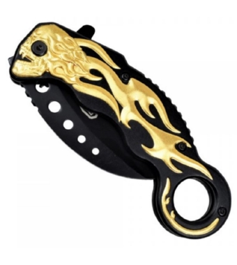 Prodotto da Steel Claw Knives, esclusivo coltello tascabile richiudibile modello karambit con colorazione nera - oro.
