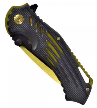 Prodotto da Steel Claw Knives, coltello tattico richiudibile in colorazione nero/oro.