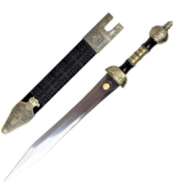 Riproduzione mini daga romana in colore nero con inserti dorati lavorati, guardia e pomolo in metallo. Compreso di fodero.