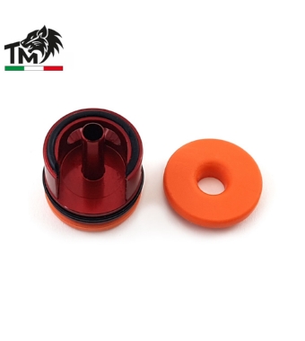 Edizione Limitata con colore rosso classico. Modello non compatibile con GearBox rinforzati V2 G&G e GearBox ICS. Testa cilindro realizzata in ERGAL al CNC con design anti-vibrazioni, QUAD-RING di tenuta d’aria per il cilindro, beccuccio allungato per una perfetta tenuta d’aria e PAD in gomma intercambiabile con 5 gradi di durezza per adattarsi a molle e R.O.F. diversificati e design rivisitato con battuta rialzata dell'O-RING frontale. I PAD in gomma presenti su tutte le teste cilindro TopMax sono intercambiabili, e a seconda della colorazione sono consigliati per molle e R.O.F. diversi. Su questa testa cilindro è pre-montato il PAD GREEN, consigliato per R.O.F. dai 20 ai 30 bb/s e/o molle dagli 95 ai 115 m/s. La gomma con cui è realizzato il PAD favorisce l’assorbimento degli urti e delle vibrazioni dovute all’impatto del pistone, lo spessore del PAD è progettato per garantire un perfetto A.O.E. (angolo di ingaggio) del pistone sull’ingranaggio settoriale, ed evitare quindi l’utilizzo di spessori sotto la testa pistone (con anche un risparmio di peso e massa battente), il diametro del PAD favorisce e coadiuva la tenuta d’aria sul cilindro, infine la forma innovativa del PAD insieme al cono realizzato sul corpo della testa cilindro, convoglia in maniera ottimale l’aria all’interno del beccuccio allungato della testa cilindro, garantendo una uscita del flusso d’aria più rapida e precisa. La dimensione e la posizione dei fori di alloggiamento garantiscono una perfetta adesione della battuta anteriore della testa cilindro, realizzata in gomma, sulle placche del GearBox. Le fresature realizzate sulla parte superiore del corpo della testa cilindro riducono e