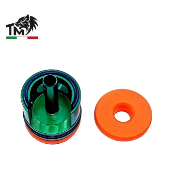 Brevetto di sistema TopMax Elaborazioni. Testa cilindro realizzata in ERGAL al CNC con design anti-vibrazioni, QUAD-RING di tenuta d’aria per il cilindro, beccuccio allungato per una perfetta tenuta d’aria e PAD in gomma intercambiabile con 5 gradi di durezza per adattarsi a molle e R.O.F. diversificati, per piattaforma Marui M4/M16 SRE.