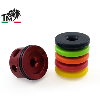 Brevetto di sistema TopMax Elaborazioni. Testa cilindro realizzata in ERGAL al CNC con design anti-vibrazioni, QUAD-RING di tenuta d’aria per il cilindro, beccuccio allungato per una perfetta tenuta d’aria e 5 PAD in gomma intercambiabili con 5 gradi di durezza per adattarsi a molle e R.O.F. diversificati e design rivisitato con battuta rialzata dell'O-RING frontale. Edizione Limitata con colore rosso classico. Modello non compatibile con GearBox rinforzati V2 G&G e GearBox ICS. I PAD in gomma presenti su tutte le teste cilindro TopMax sono intercambiabili, e a seconda della colorazione sono consigliati per molle e R.O.F. diversi. In questo kit con la testa cilindro sono presenti tutte le tipologie di PAD, per gestire l’elaborazione della replica con R.O.F. dai 10 ai 40 bb/s e/o molle dagli 85 ai 150 m/s (testato anche con configurazioni D.S.G.). La gomma con cui sono realizzati i PAD favorisce l’assorbimento degli urti e delle vibrazioni dovute all’impatto del pistone, lo spessore dei PAD è progettato per garantire un perfetto A.O.E. (angolo di ingaggio) del pistone sull’ingranaggio settoriale, ed evitare quindi l’utilizzo di spessori sotto la testa pistone (con anche un risparmio di peso e massa battente), il diametro dei PAD favorisce e coadiuva la tenuta d’aria sul cilindro, infine la forma innovativa dei PAD insieme al cono realizzato sul corpo della testa cilindro, convoglia in maniera ottimale l’aria all’interno del beccuccio allungato della testa cilindro, garantendo una uscita del flusso d’aria più rapida e precisa. La dimensione e la posizione dei fori di alloggiamento garantiscono una perfetta adesione della battuta anteriore della testa cilindro, realizzata in gomma, sulle placche del GearBox. Le fresature realizzate sulla parte superiore del corpo della testa cilindro riducono e mitigano le vibrazioni derivanti dall’impatto del pistone e garantiscono la riduzione drastica/eliminazione dei rischi di rotture in testa delle placche del GearBox. Il beccuccio della testa cilindro ha diametro esterno di 4,70mm, presenta una lieve stondatura in punta per uno scorrimento libero dello spingi pallino e ha una lunghezza leggermente maggiore rispetto ad altri prodotti sul mercato per aiutare lo spingipallino a scorrere più linearmente possibile all’interno della camera T-HopUp. La testa cilindro TopMax risulta essere compatibile sia con GearBox V2 (quali M4, MP5, G3, Minimi), sia con GearBox V3 (AK e similari). Per ottenere la massima scorrevolezza possibile si consiglia l’accoppiamento con spingipallini TopMax. Per montare il PAD di battuta consigliamo l’utilizzo della nostra colla specifica di fissaggio TMCLLP, o in alternativa, l’utilizzo di Loctite SuperAttack Gel o similari