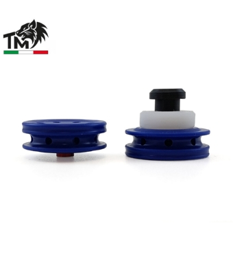 La testa pistone BLUEPOWER è realizzata in DELRIN al CNC su misure specifiche della TopMax Elaborazioni. La struttura in DELRIN rende questa testa pistone affidabile, duratura e incredibilmente adatta a qualsiasi tipologia di configurazione. La testa pistone BLUEPOWER è realizzata con fori antivuoto assiali-interni e fori di uscita radiali, che consentono una migliore distribuzione dell’aria sull’O-RING di tenuta, velocizzando la sua dilatazione in fase di compressione. Rispetto alla testa pistone REDPOWER, nella BLUEPOWER la dimensione e la posizione dei fori radiali è ulteriormente diversa per ottenere una maggiore aggressività in fase di compressione dell’O-RING mantenendo comunque stabilità, costanza e precisione nel tiro. La forma della parte anteriore della testa pistone BLUEPOWER è stata studiata per ridurre ulteriormente lo stress dovuto all’impatto con il PAD della testa cilindro anche a R.O.F. elevati. La testa BLUEPOWER non presenta il doppio O-RING di tenuta/centramento, ma presenta un piccolo scasso che diminuisce la superficie di contatto con l’interno del cilindro, per ridurre al minimo gli attriti. L’altezza totale della testa pistone TopMax risulta standardizzata alle dimensioni delle altre teste pistone presenti sul mercato. L’inserto in ERGAL e DELRIN per il fissaggio della testa pistone sul pistone è leggermente più corto rispetto alle dimensione standard di mercato, per poter utilizzare la testa pistone TopMax su qualsiasi pistone in commercio. La testa pistone BLUEPOWER presenta la camera di compressione più stretta di quella della REDPOWER per avere un tempo di apertura dell’O-RING in compressione più veloce e garantire la piena compressione del volume d’aria del cilindro in maniera quasi istantanea appena l’O-RING sorpassa la fresatura del cilindro. In termini di tenuta d’aria e velocità di compressione la testa BLUEPOWER risulta essere una delle teste pistone più performanti sul mercato. Utilizzabile su ogni configurazione, dalle low-R.O.F. alle high-R.O.F., consigliamo comunque l’utilizzo della testa BLUEPOWER su configurazioni high-R.O.F. con canne interne mediamente corte, per poter sfruttare la compressione anticipata che deriva dalla posizione dei fori antivuoto. Gli STRESS-TEST effettuati sulla testa pistone BLUEPOWER sono stati eseguiti con molle superiori a quelle previste di legge, per cui il prodotto vi garantirà affidabilità e performance anche con configurazioni più spinte. Per ottenere le massime performance si consiglia l’abbinamento con il pistone e la testa cilindro TopMax.
